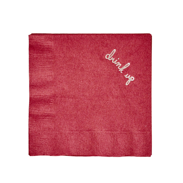 Add a little fun to your next gathering with these burgundy cocktail napkins! Featuring a hand-lettered command “Drink Up” in silver, they’re perfect for keeping things stylish and spill-free.