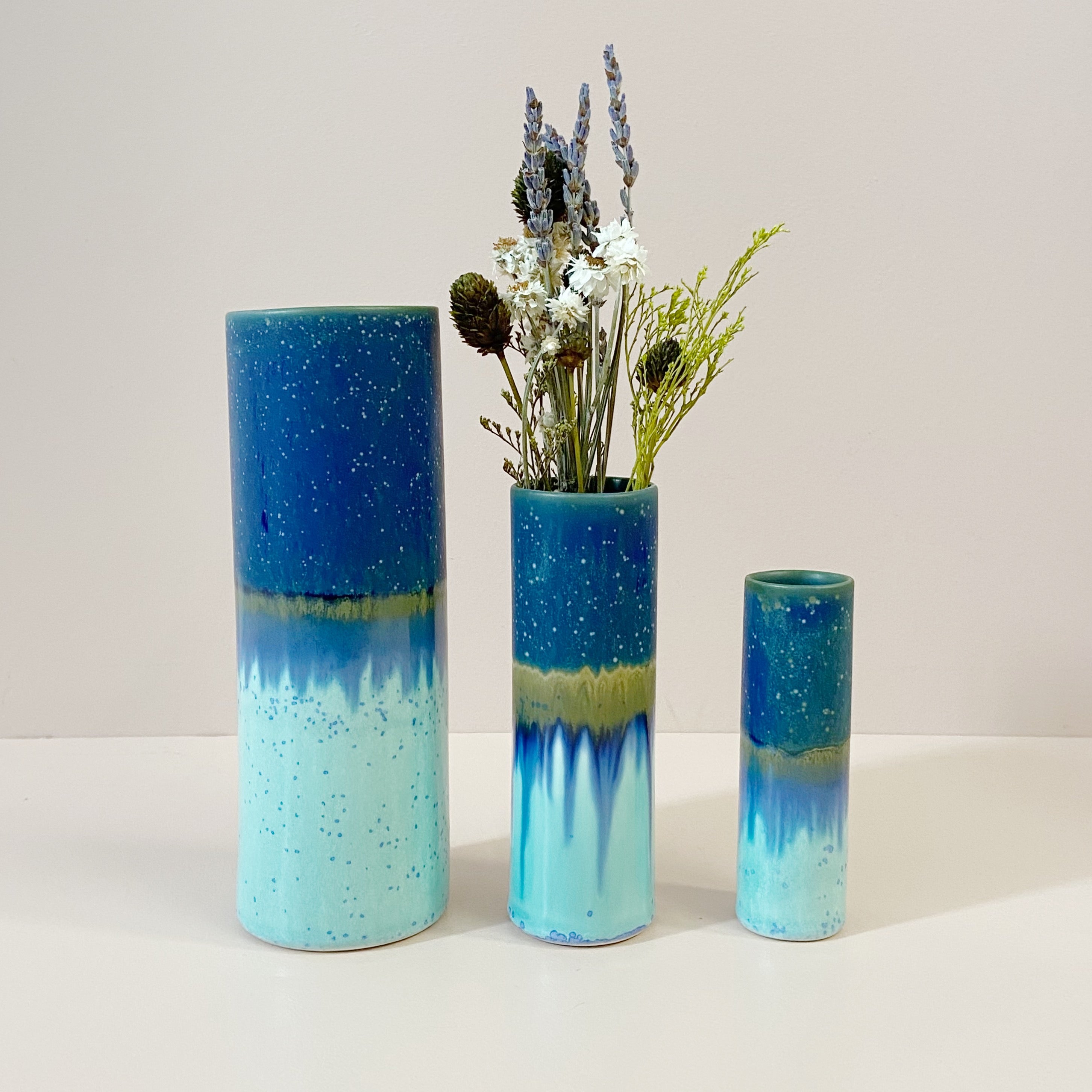 Special hand glazed cylinder bud vases in three sizes. Perfect for a little sprig of your favorite flowers, and they would make an excellent gift.
