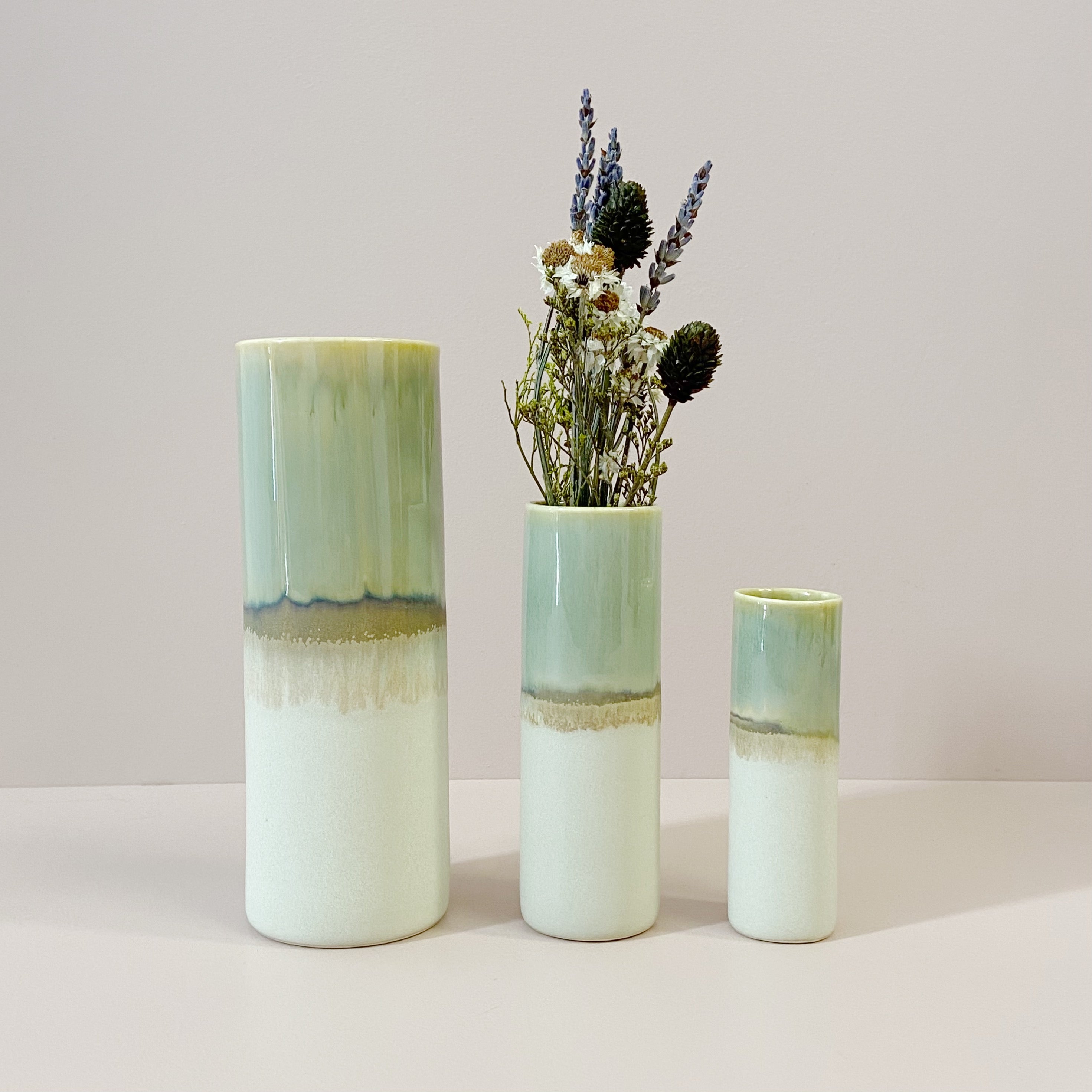 Special hand glazed cylinder bud vases in three sizes. Perfect for a little sprig of your favorite flowers, and they would make an excellent gift.