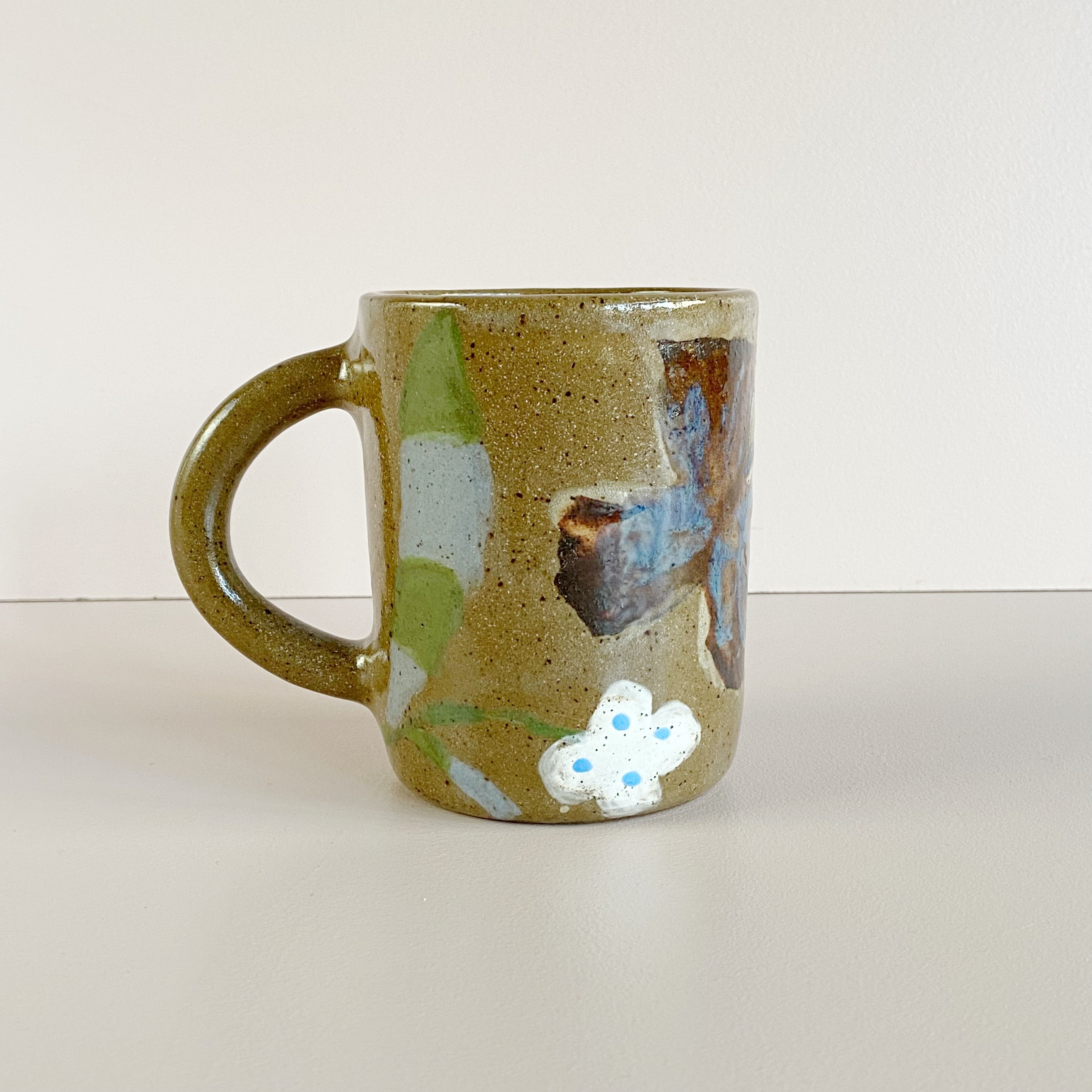 A sturdy hand thrown earthy brown mug featuring a hand painted wrap-around rustic floral design.