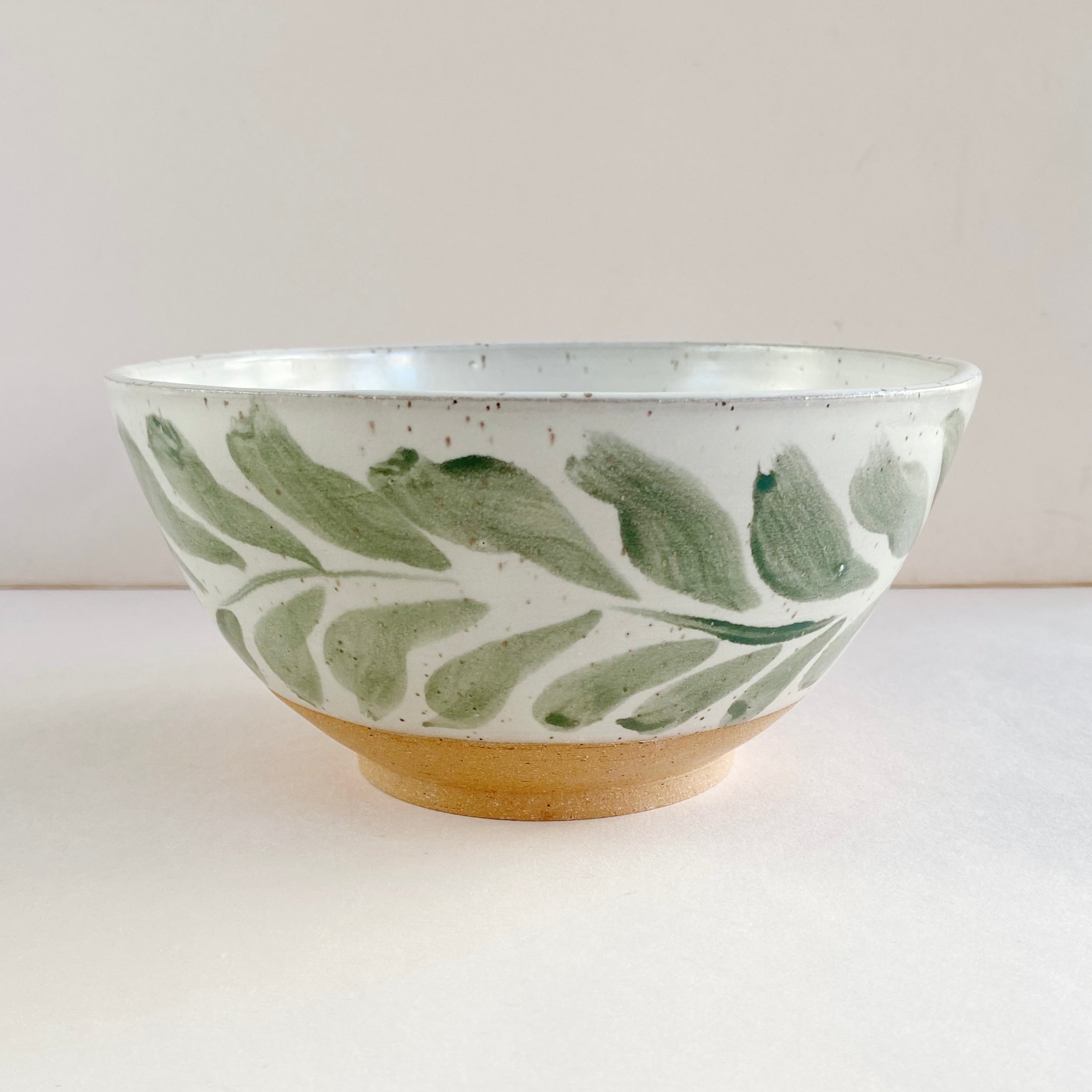 A beautiful ceramic serving bowl featuring a green brushstroke leaf design over a speckle dip glaze and an unglazed warm clay base.