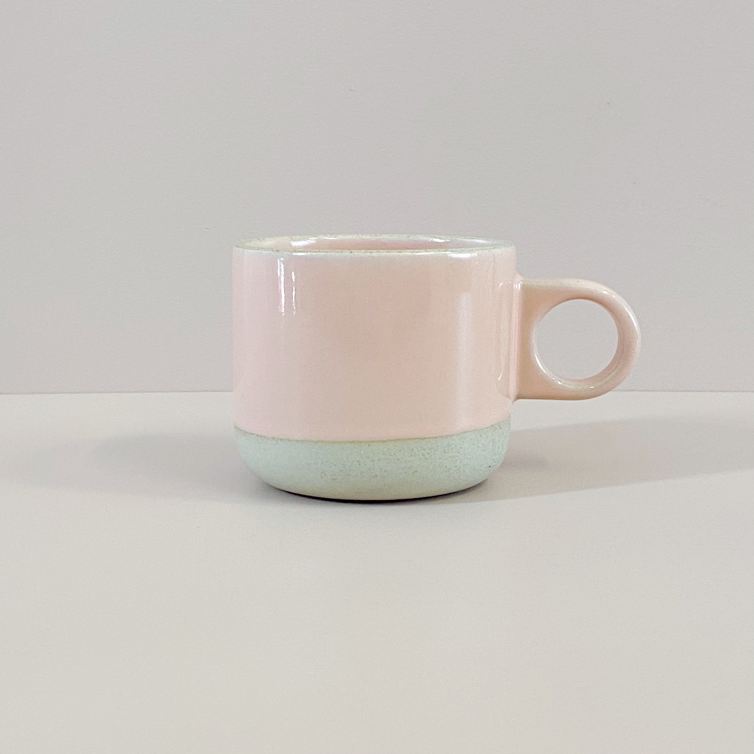 Ease into your morning with this stylish handmade stoneware mug, featuring a blush pink dip glaze and circular handle.