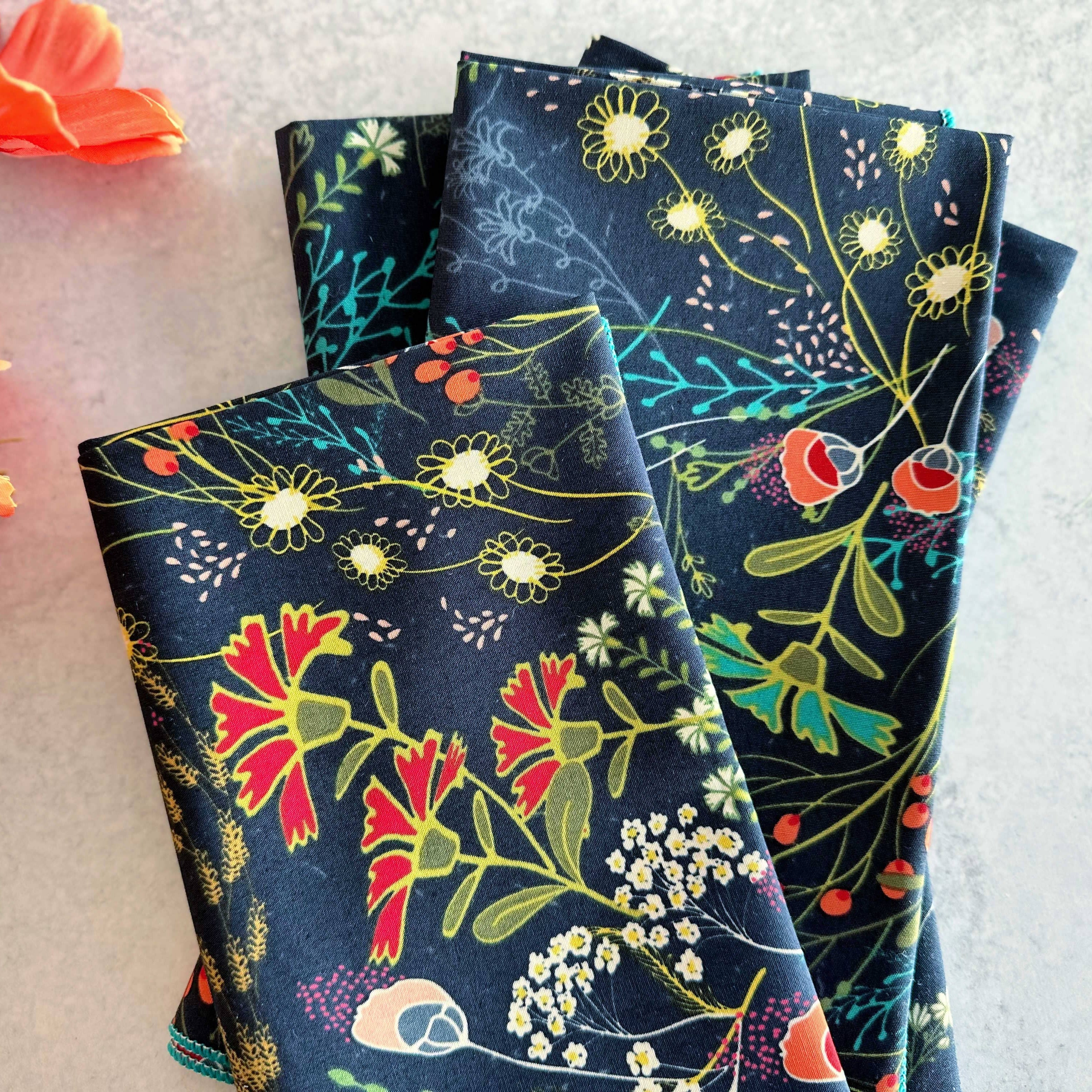 A beautiful print in navy blue with pops of coral, teal, lime and the a bit of pale pink. Super soft and easy to care for.