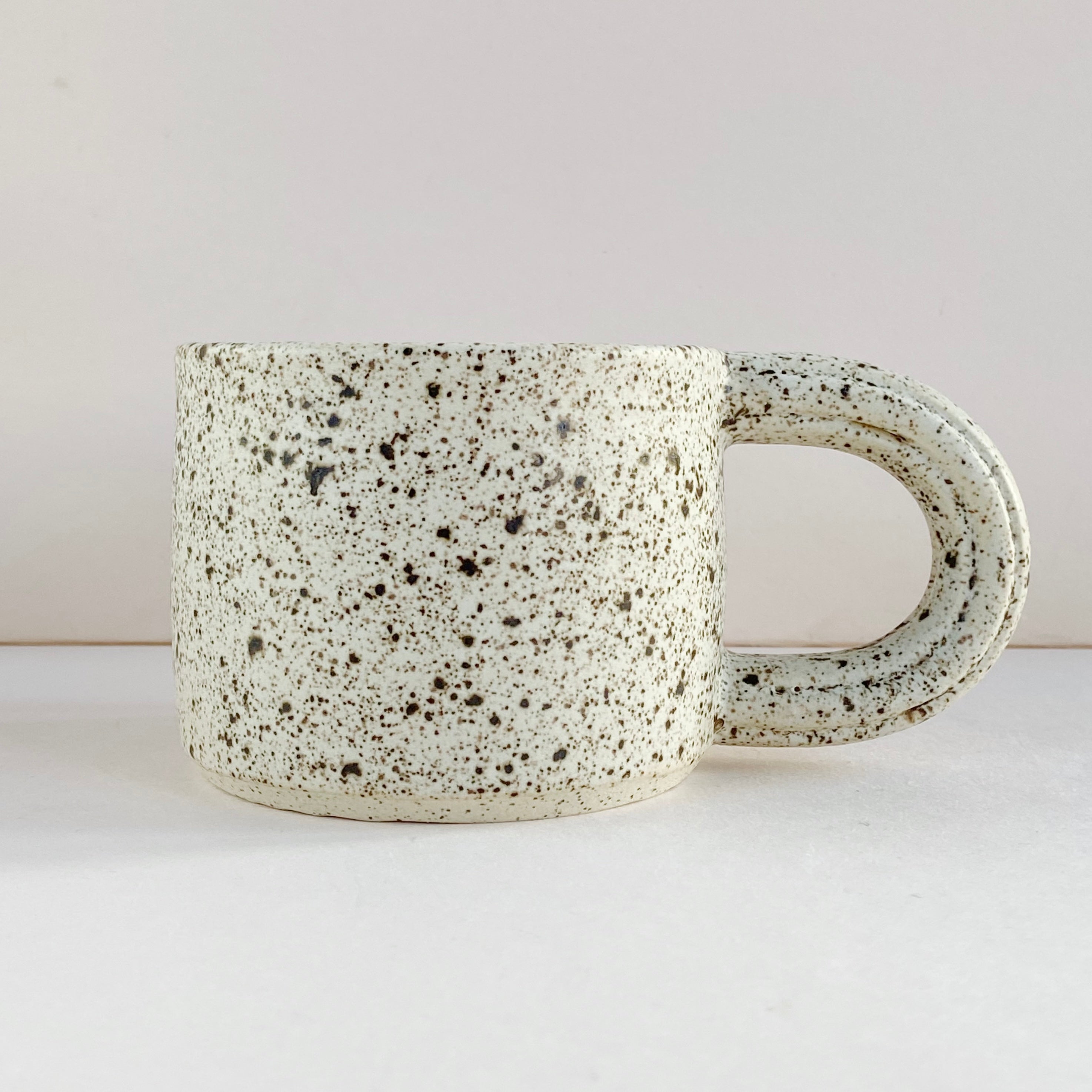 This clay stoneware mug has a natural earthy look with a stylish sturdy handle. Each mug is one of a kind and will vary in speckling.