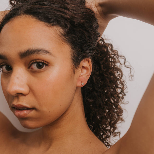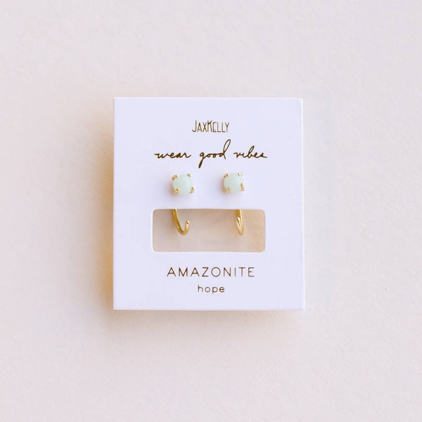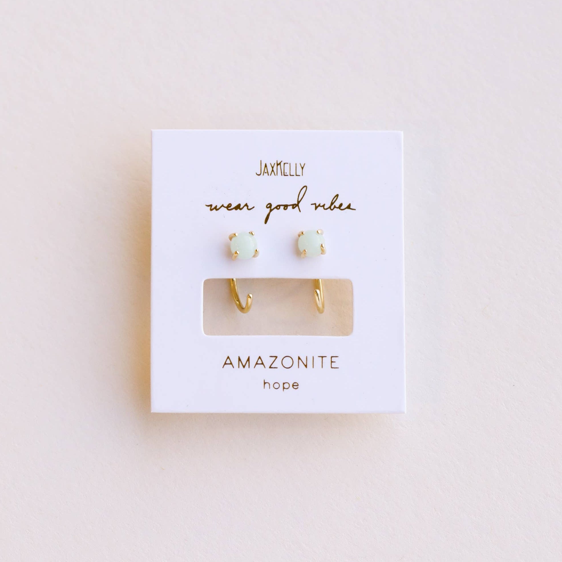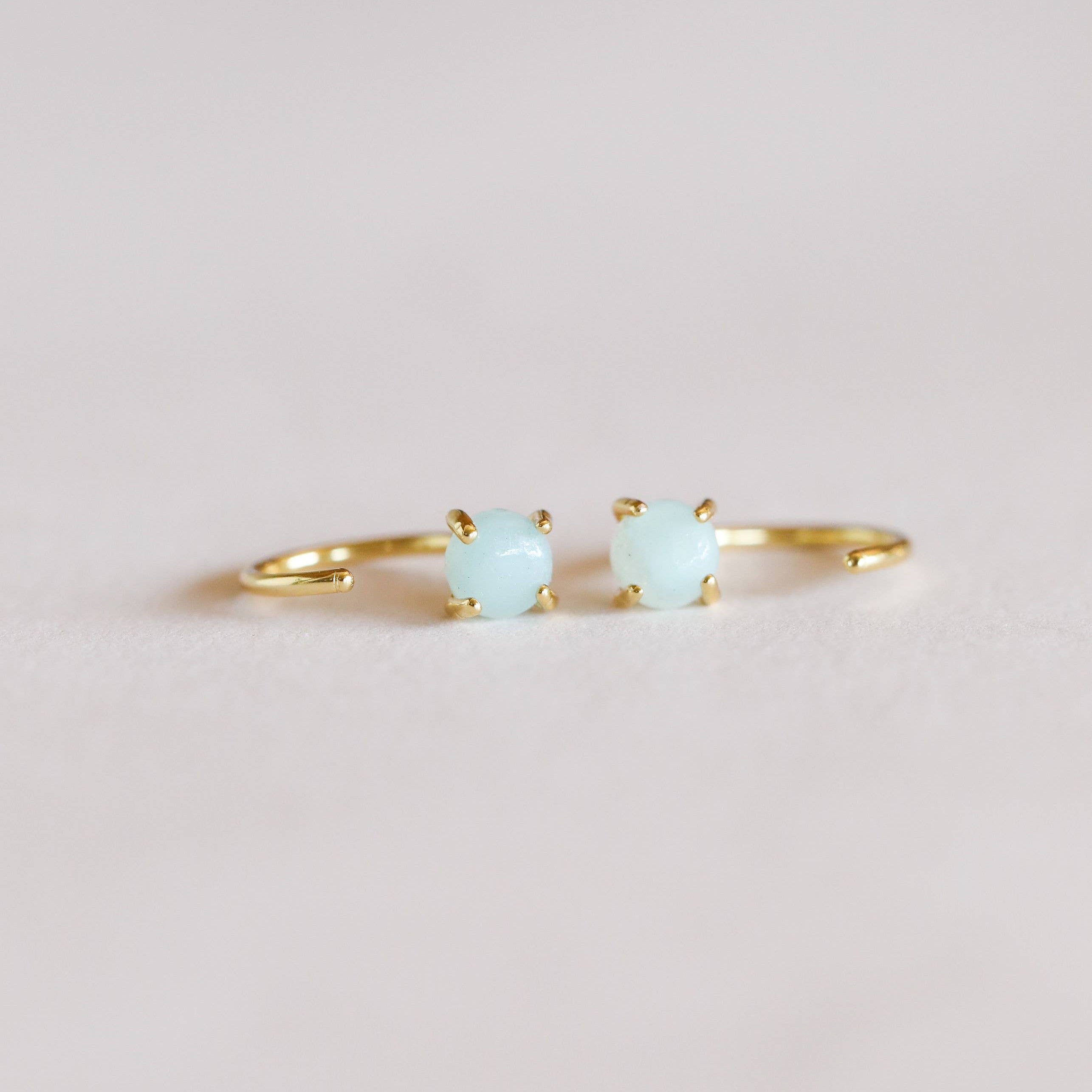 These huggies feature an Amazonite gemstone that hugs tight to your ear. Loop the non-stone end through like you would a regular post, and let the stone sit against your ear.
