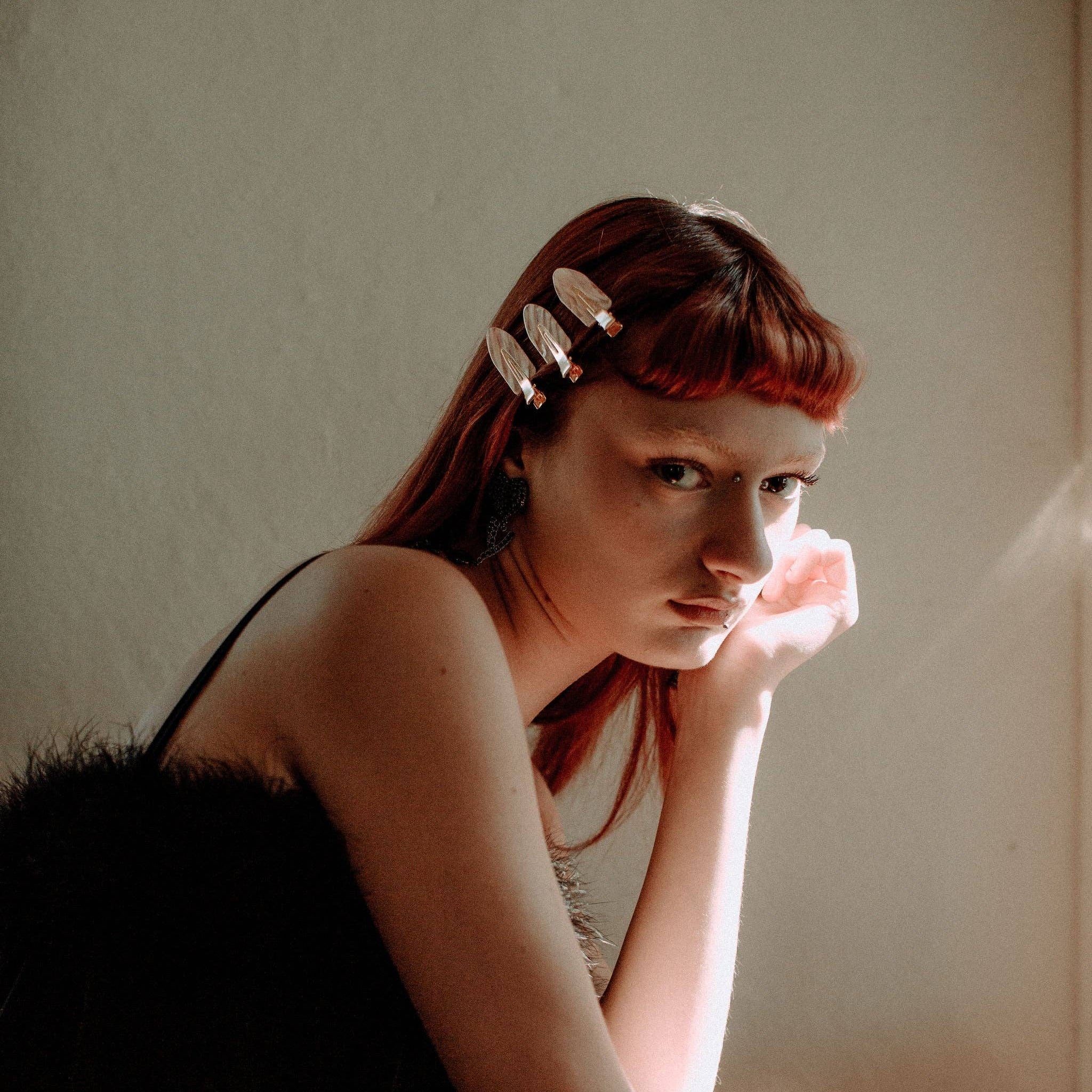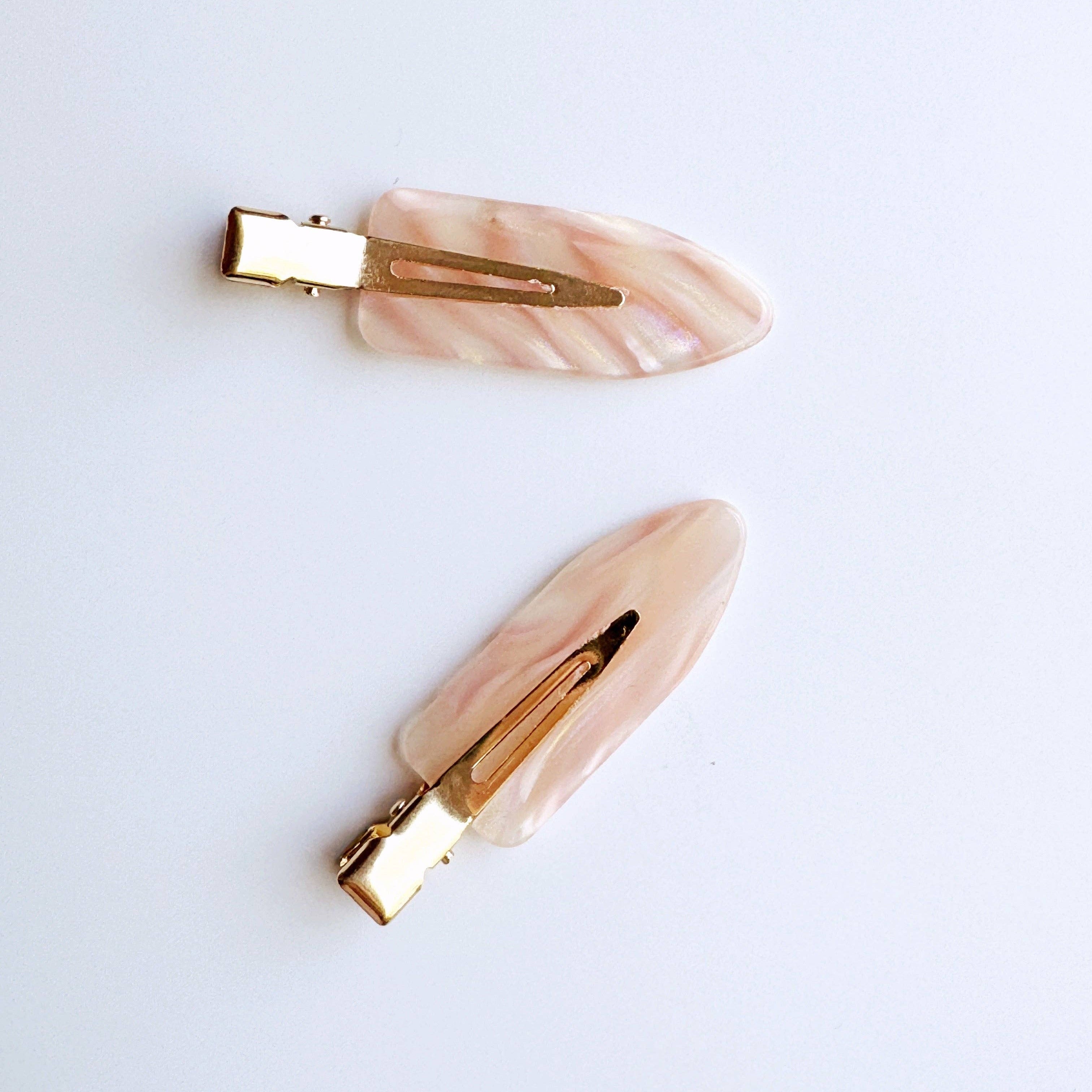 These creaseless setting clips are ideal for makeup application, skincare, and styling in all types of hair. The Pink Shimmer Setting Clips come in a set of two light pink clips with iridescent inclusions.