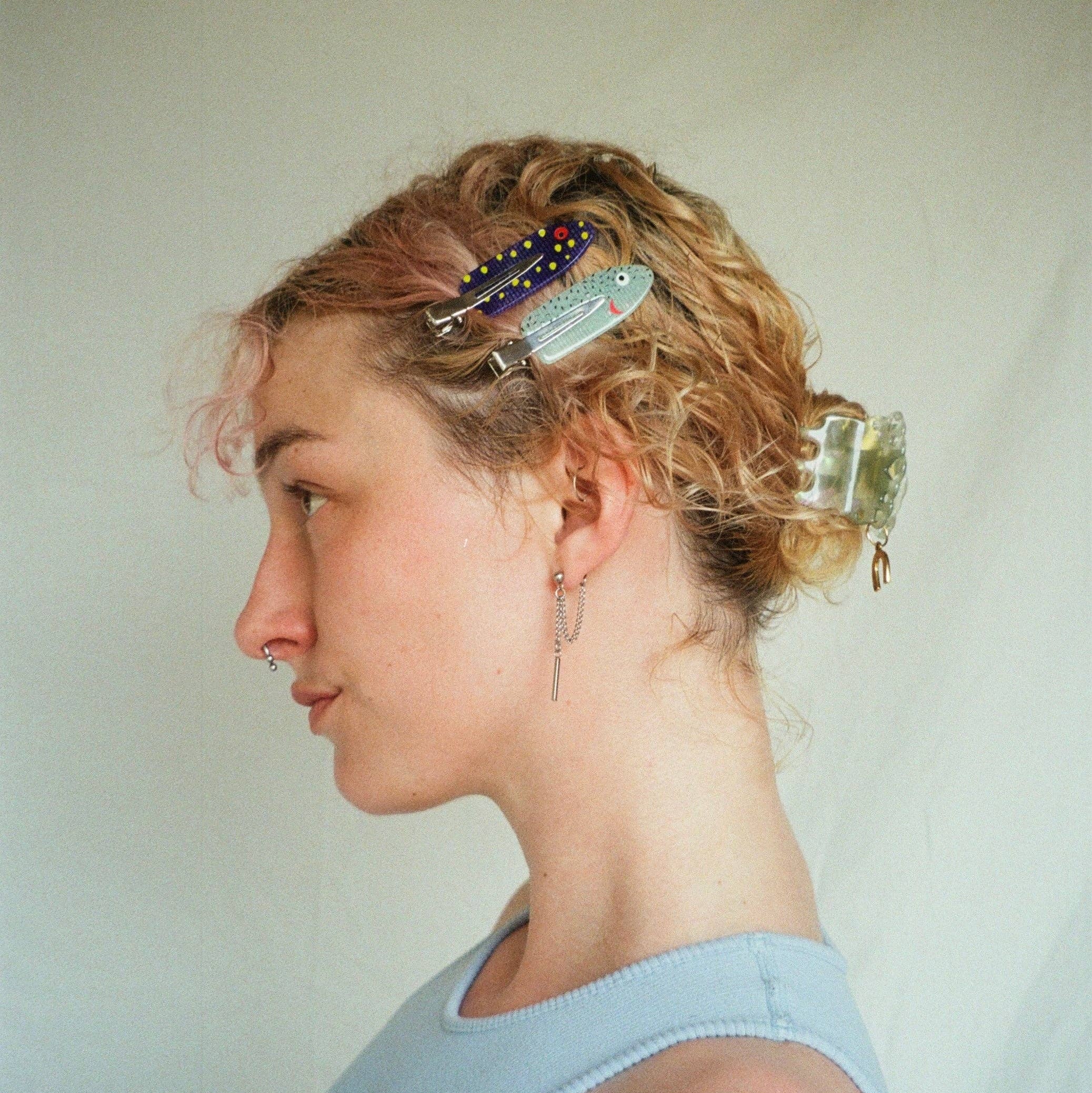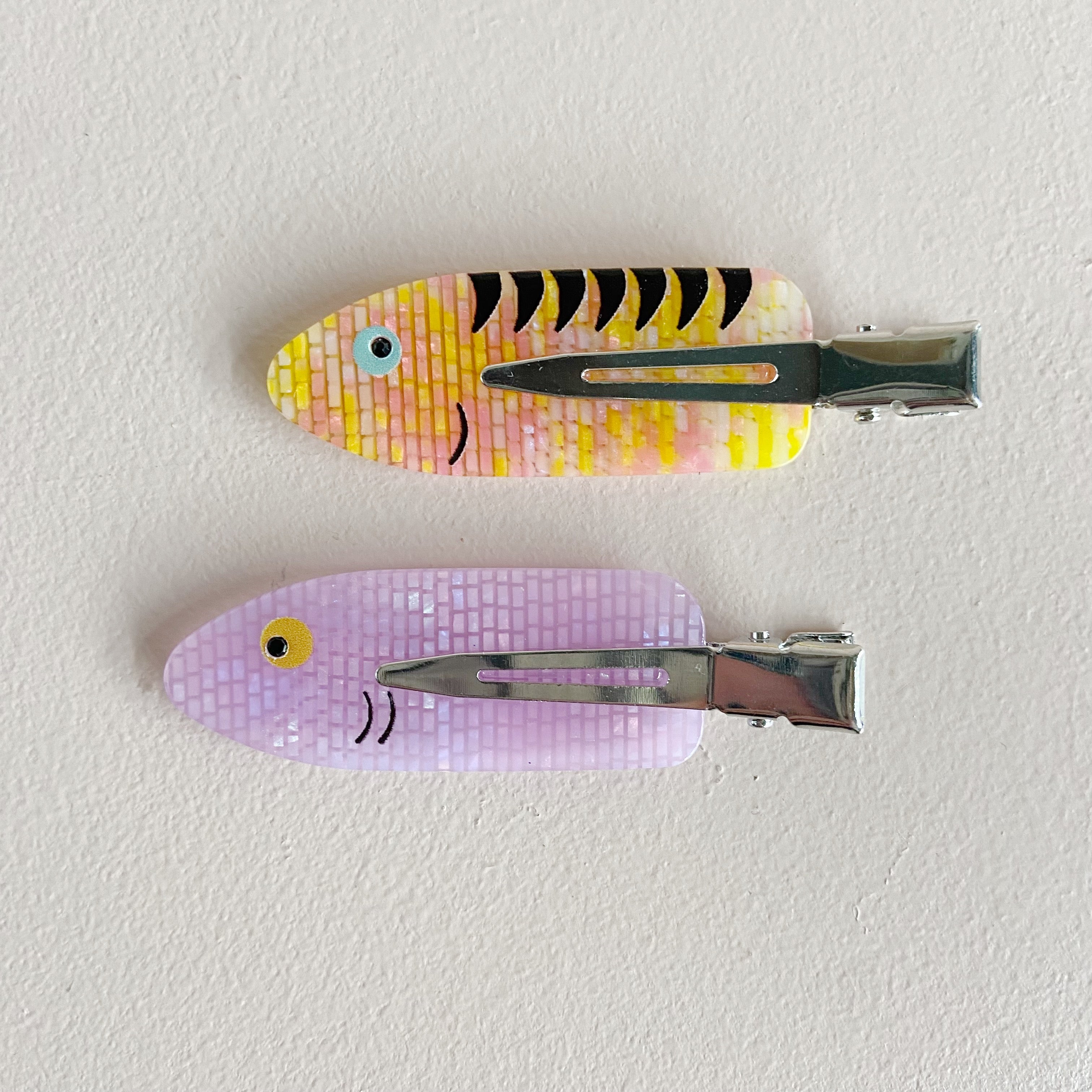 Catch of the day! Lure in the compliments with the Tackle Box Clip Set. These fishy shaped clips come in an array of colors with printed body details and gem eyes. Available in two sets of 2: one featuring cool blue tones and the other sporting warm shades of purple and orange.