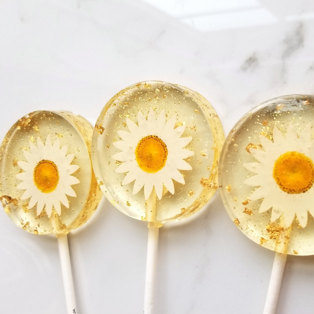 Sweet Caroline's Confection's famous swirl lollipops are a super sweet and special handcrafted treat. This mandarin orange flavor features an edible daisy flower suspended in clear candy that sparkles with gold and white glitter.