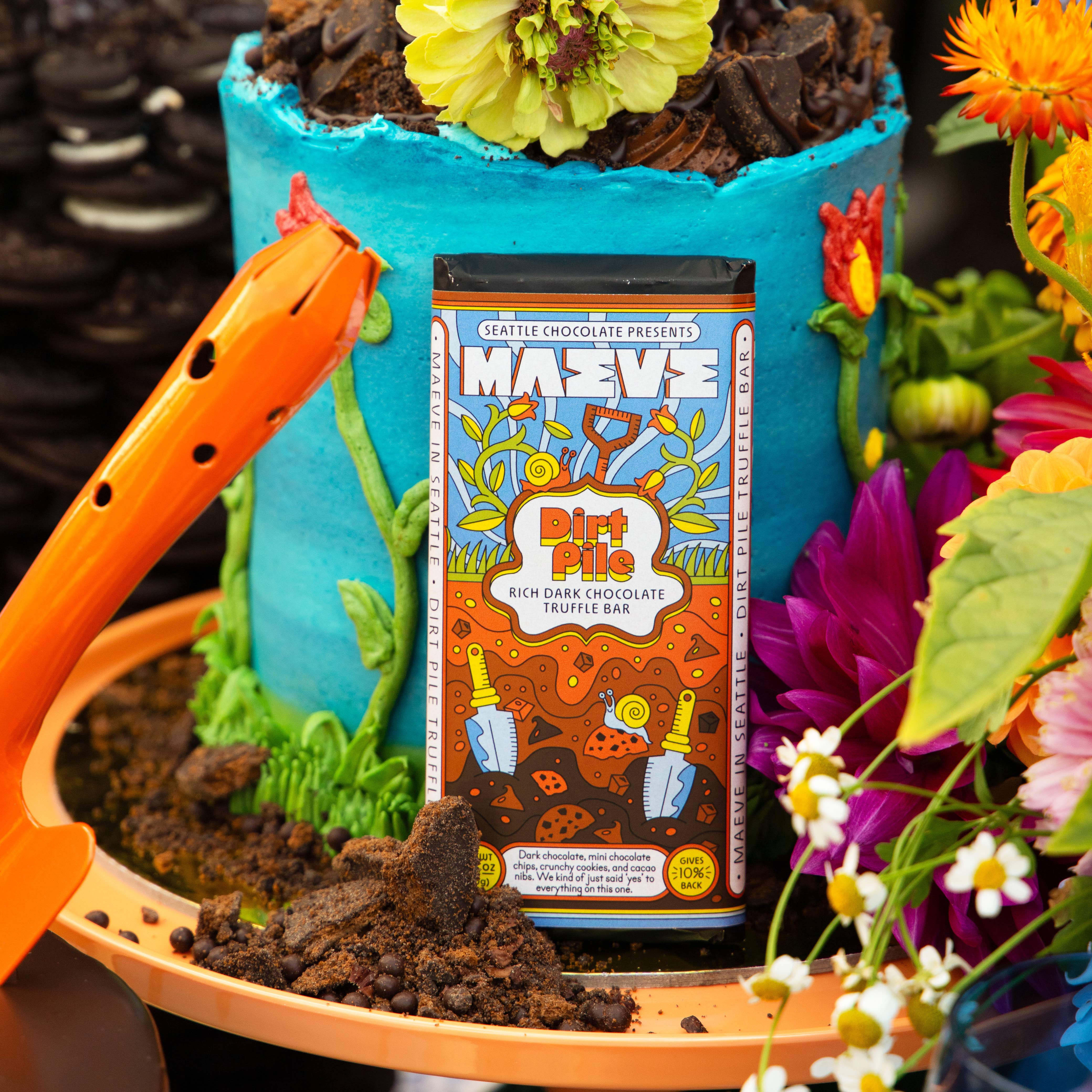 Dark chocolate packed with mini chips, crunchy cookies, and cacao nibs for a playfully delicious dirt-inspired bite.