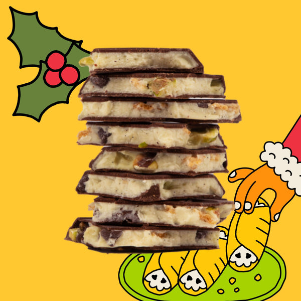 Dark chocolate with a white chocolate meltaway center, dotted with mini chocolate chips, crispy cannoli flakes, and a sprinkle of pistachios.