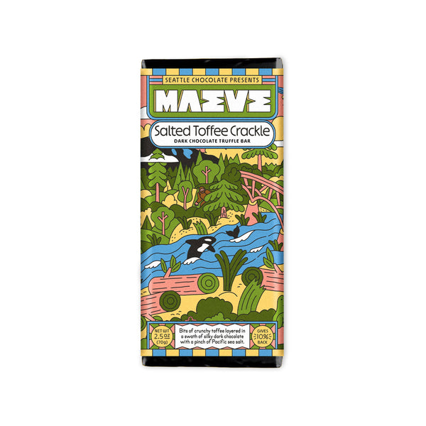 Bits of crunchy toffee are layered in a swath of silky dark chocolate. A pinch of Pacific Sea Salt brightens the flavor and checks the sweetness in this dark chocolate toffee bar.