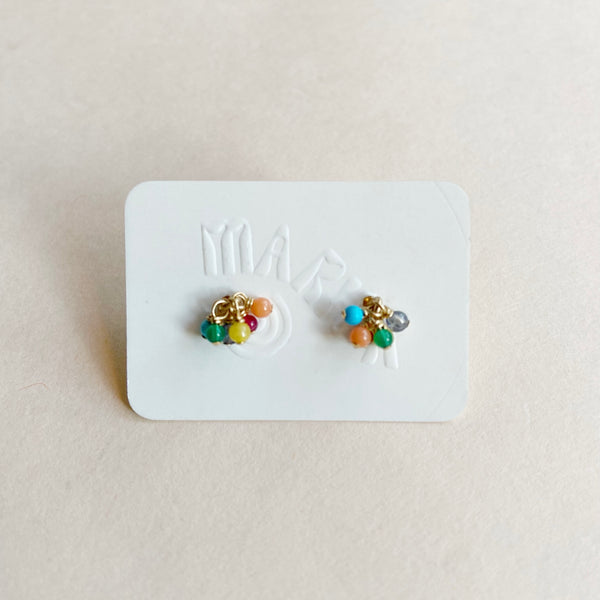 A sprinkling of tiny rainbow gemstone beads on a gold fill stud earring base.