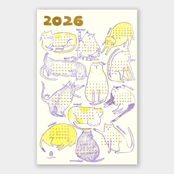 This 2026 perfect-at-a-glance calendar for cat lovers is printed on toothy, textured cover stock with vibrant Risograph inks. Frame it, hang it, or tack it up in your office or kitchen for a bit of cheeky & elevated decor.