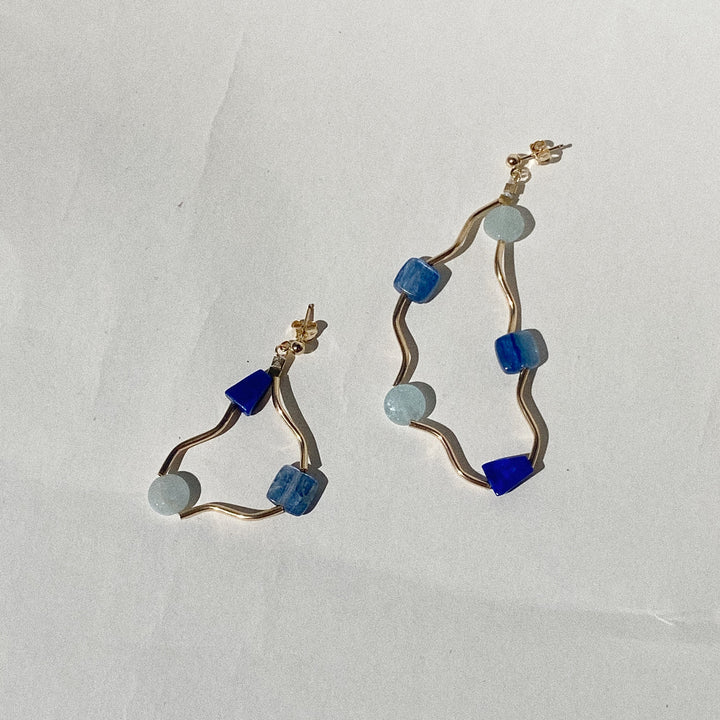 • Earrings that plays with shape and line featuring Lapis Lazuli, Kyanite, and Aquamarine.