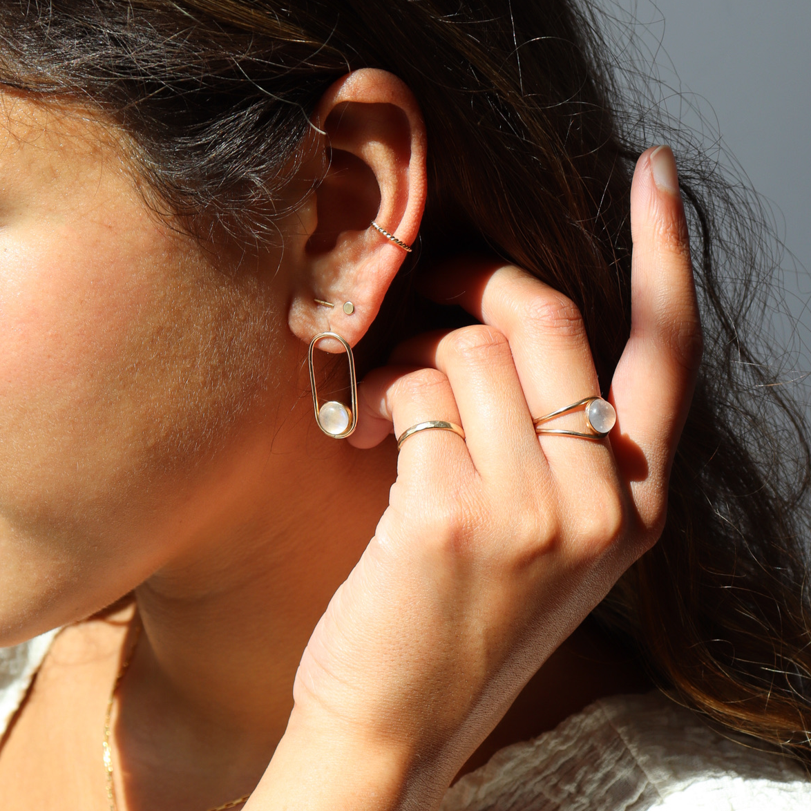 The Esme Earrings balance modern design with natural beauty. A lightweight oval frame cradles a soft moonstone, catching the light with every movement. Versatile and understated, they complement both minimal and statement looks.