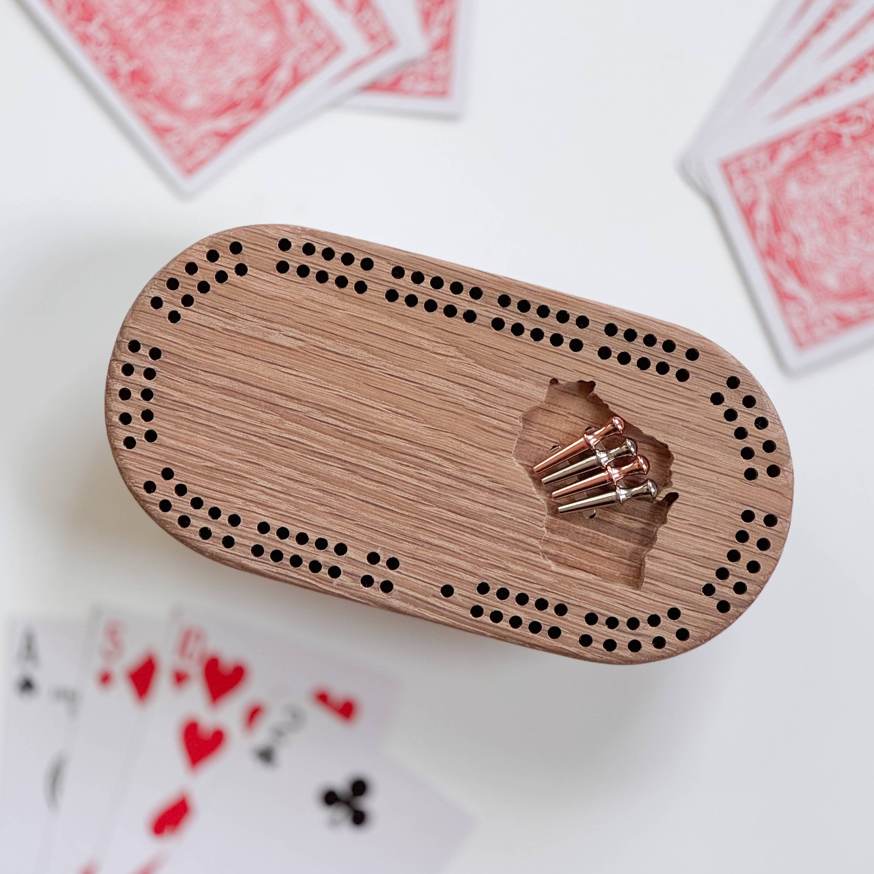 About the size of an iPhone, these travel cribbage boards fit perfectly in your back pocket or fanny pack. Made from solid wood with a heavy duty finish and magnets to keep the pegs in place - they are durable and ready to travel on all of your adventures.